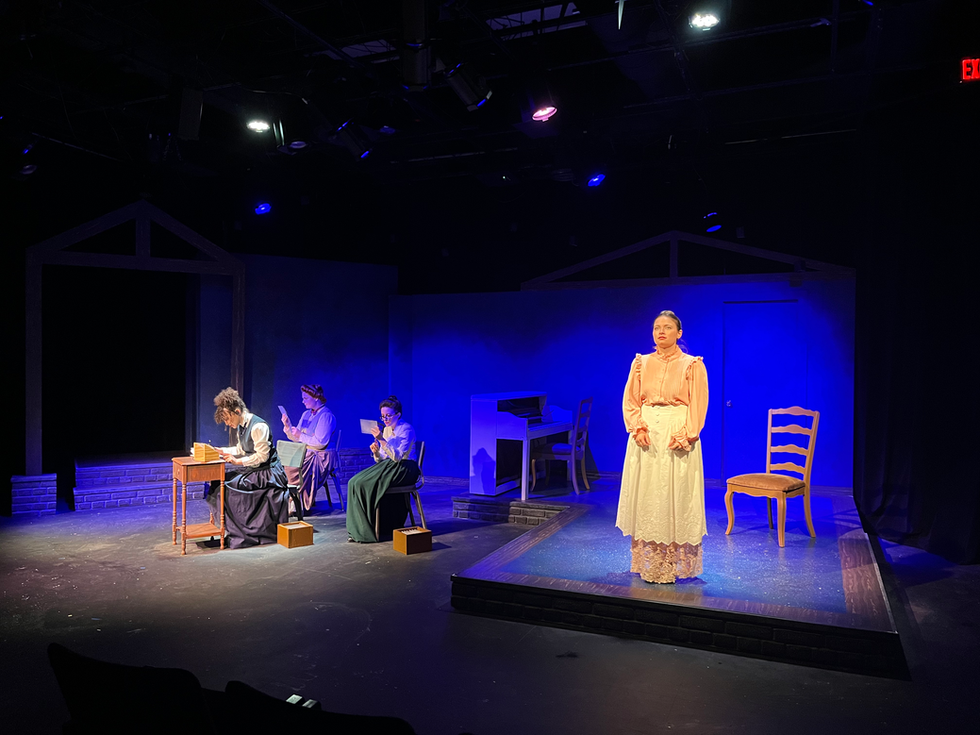 Taking place in our intimate black box space, Silent Sky follows the historic figure Henrietta Leavitt making incredible scientific discoveries of our universe through the stars, all while handling society's expectations of her role as a woman in the workplace. I managed a team of 2-5 people of varying experience levels in scenic painting who were willing to help with our tight paint schedule. Most of this show called for wood graining and a fun starry night texture! :) I also had the opportunity to work as the lighting designer, which gave me direct insight and opportunity to experiment with stage color theory!
